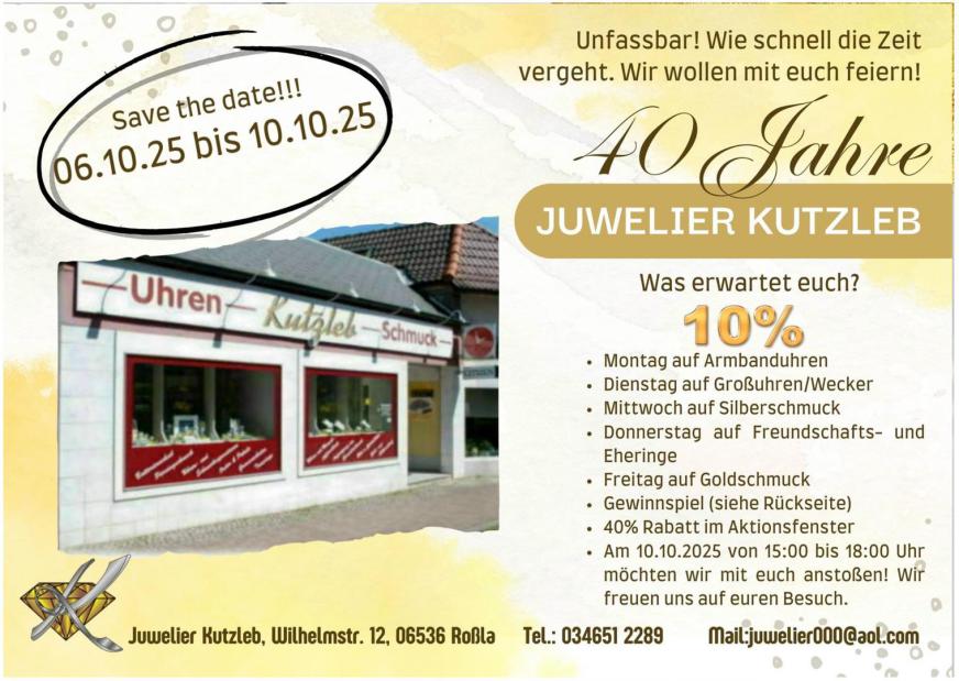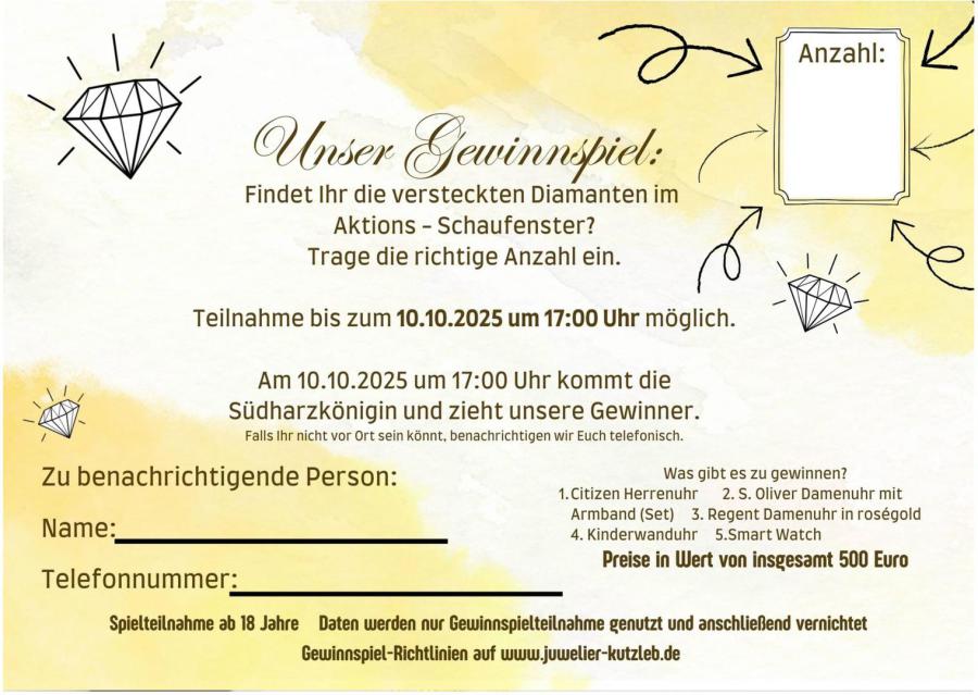 Veranstalter des Gewinnspiels ist Juwelier Kutzleb, Wilhelmstr.12, 06536 Südharz.